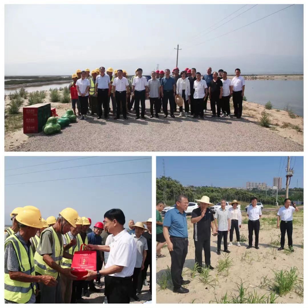隨后,公司領導一行人來到鹽湖項目11號堤埝施工現(xiàn)場,慰問在高溫酷暑下堅持奮戰(zhàn)在一線的工人,并為他們送去防暑降溫慰問品。同時,深入鹽湖堤埝二號灘和19號路,詳細了解灘面護坡綠化情況,坡面綠草茵茵,不同種類植物長勢喜人;現(xiàn)場查看了傾斜電桿更換和扶正處理后情況,一定程度上消除了安全隱患,確保周邊居民和鹽池防汛調水用電安全,同時也起到了美化環(huán)境效果。