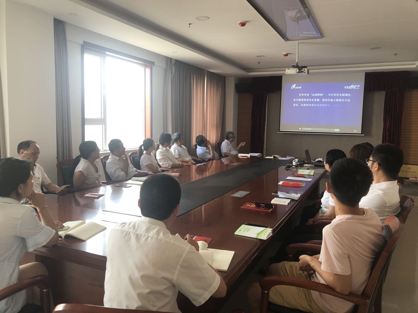 全體與會人員觀看《用忠誠擔(dān)當(dāng)書寫勇毅前行的山西答卷--新冠肺炎疫情防控斗爭啟示錄》公益片。