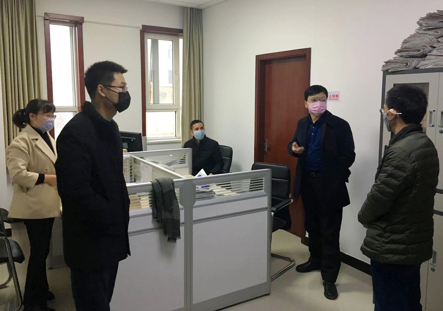范永勝同志對(duì)往來人員登記表進(jìn)行了詳細(xì)查看,要求工作人員要加強(qiáng)防范意識(shí),做好消菌殺毒、通風(fēng)換氣等必要措施。